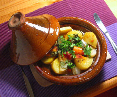 E’ un piatto unico molto succulento a base di carni e verdure. La particolarità è la cottura in una speciale pentola poco profonda in terracotta da mettere direttamente sul fornello. La pentola è composta da una base tonda in terracotta con bordo rialzato che funge anche da piatto da portata con un coperchio conico. L’oggetto di solito è decorato o smaltato. La cottura dura un’oretta e sul fornello, tra la fiamma e la pentola, occorre posizionare uno spargifiamma. Nell’alzare il cono si sprigionano i vapori di cottura, carichi di odori avvolgenti! Le varianti sono tante, io per due-tre persone di solito inserisco: