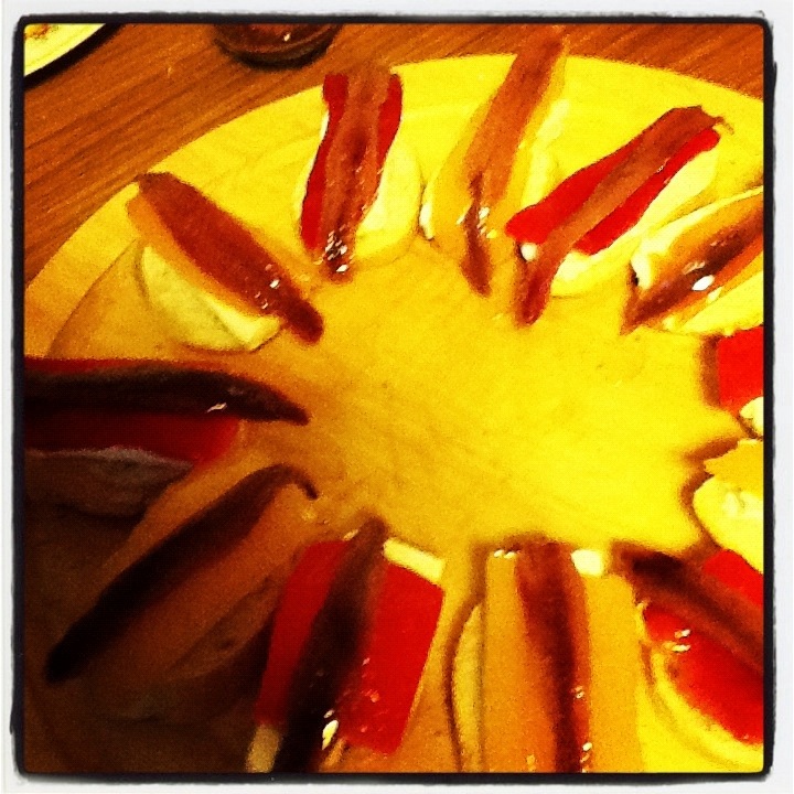 Ho preparato pinxtos con carote e salmone, pinxtos con primo sale, peperoni e acciughe. Poi le acciughe del Mar Cantabrico, i peperoni ripieni col tonno in salsa di pomodoro. Il pan tomate cpn il prosciutto non poteva mancare. Quindi una tartare di manzo con composta di cipolle di Tropea. Abbiamo terminato con la cassata, giusto per tributare il consueto omaggio alla Sicilia delle origini e del sangue.