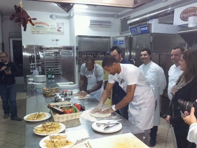 Altro giro, altra corsa, altri piatti preparati nel Master Juvecaserta Chef che ha vissuto una serata tutta a ‘stelle e strisce’ ma dal gusto, prettamente, campano. A sfidarsi a suon di pizze e calzoni sono stati i due esterni bianconeri Andre Collins e Charlie Bell. Una sfida tra novelli pizzaioli nella cornice della scuola di cucina “Dolce&salato” di Maddaloni davanti agli occhi divertiti di tanti tifosi, di coach Sacripanti (prossimo partecipante alla manifestazione) e di Michele Croccia, campione del mondo di pizza acrobatica. Ha aperto le danze il folletto Collins che si è cimentato nella ‘Pizza Bomba’ e nel ‘Calzone Junior’ (dedicato al figlioletto presente in sala); l’ex Ferrara ha utilizzato questi ingredienti: funghi, pomodoro, friarielli, mozzarella, olive nere e scamorza, facendosi aiutare nei tempi di cottura ma sfoderando una buona mano anche nel momento di ‘impastare’ il tutto. Stesso dicasi per Charlie Bell, buono nella preparazione prima di cominciare a lavorare sulla ‘Pizza Flint’ (in onore della sua città natale) e nel ‘Calzone Love’. L’ex Spartans ha utilizzato pomodoro, salsiccia, tonno, olive, mozzarella (che ama alla follia e chiama simpaticamente ‘ball of cheese’) e provola. Alla fine della battaglia a suon di gag e sfottò ha vinto Bell che ha dimostrato di aver preso subito confidenza con gli usi e costumi culinari della città della Reggia.