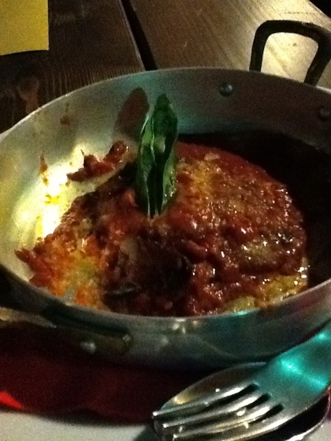 Tutti dentro, e tutti ospiti, senza conti a sorpresa. Idea riuscitissima e coinvolgente, ma non da tutti. Grande serata. Non e’ facile lavorare bene, e cucinare meglio, per cosi’ tanta gente. Ma ragazzi giovani, capaci, con voglia, si sono dimostrati eccezionali. Due gli antipasti: parmigiana di melanzane e suppli, serviti nel tegamino.