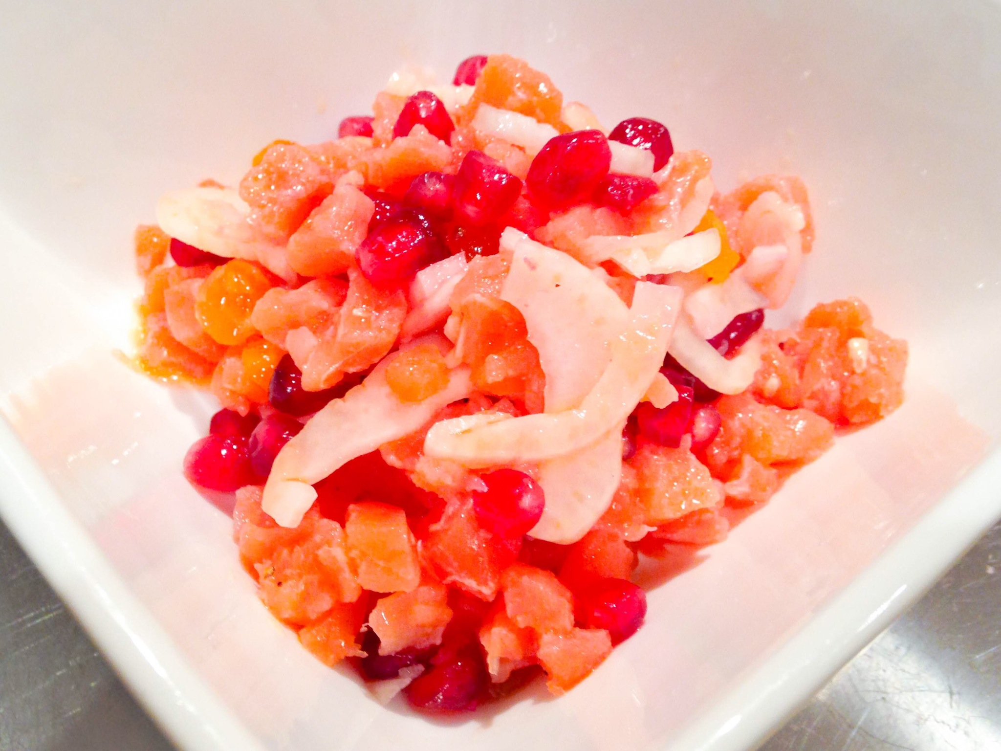 Condire il tutto con melograno, uva passa ed emulsione di olio, limone e