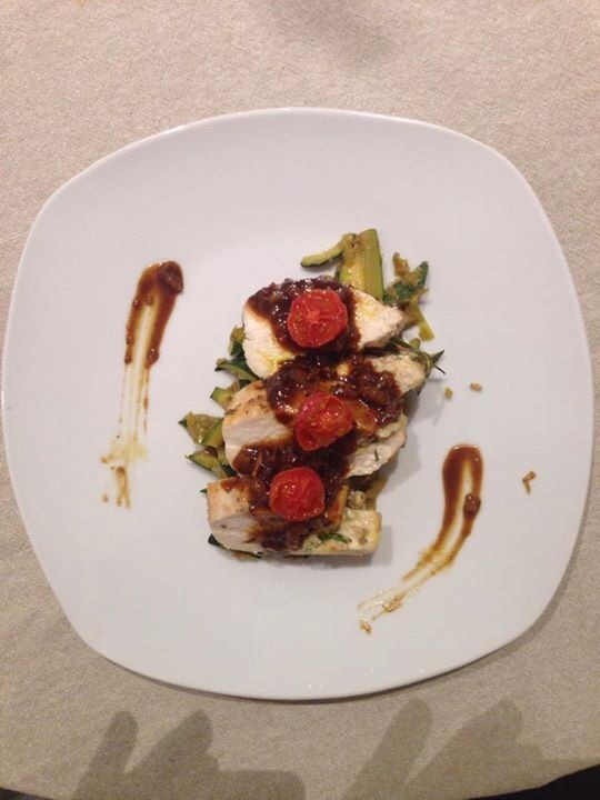 Infine scaloppate il pollo impiattandolo sopra delle zucchine trifolate e ricopritelo con la glassa di noci. Guarnite con pomodorini confit.
