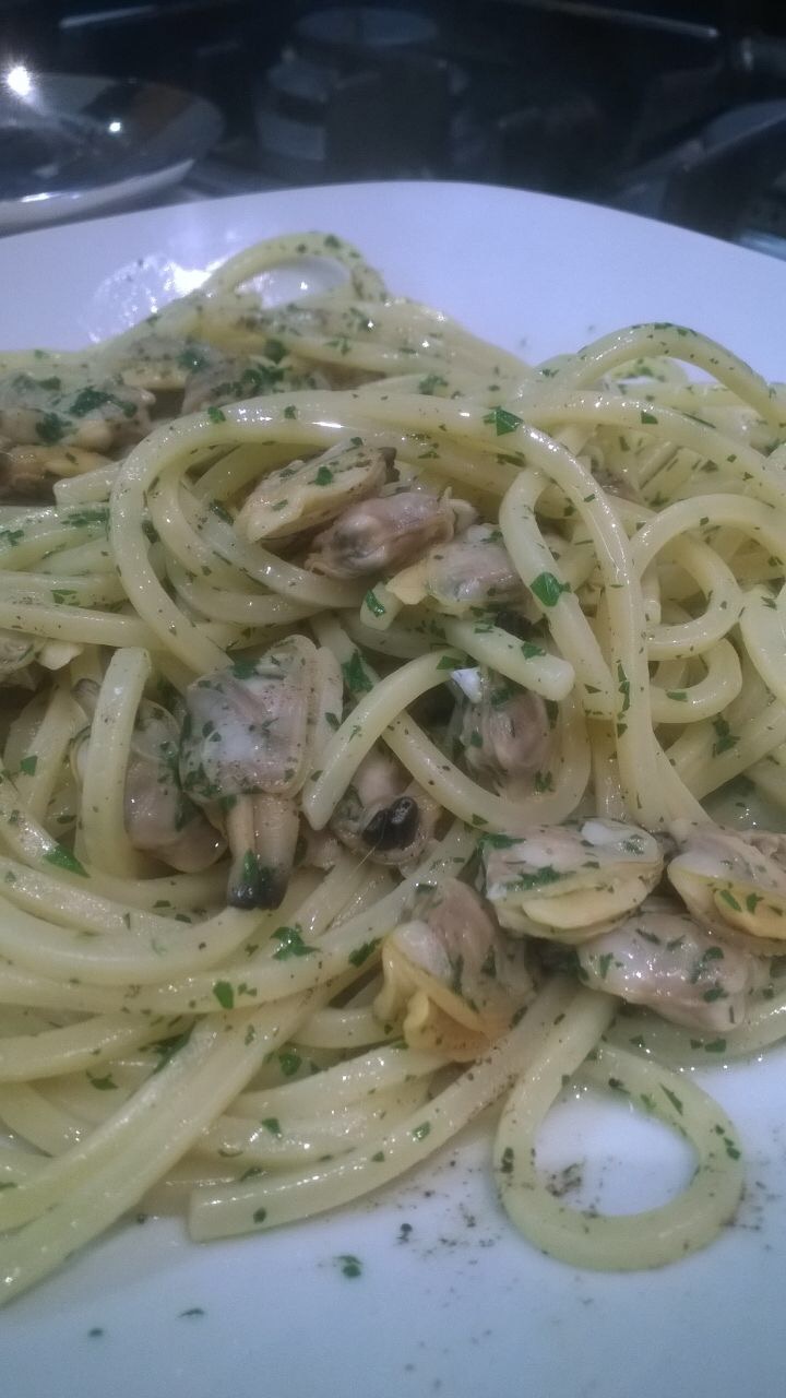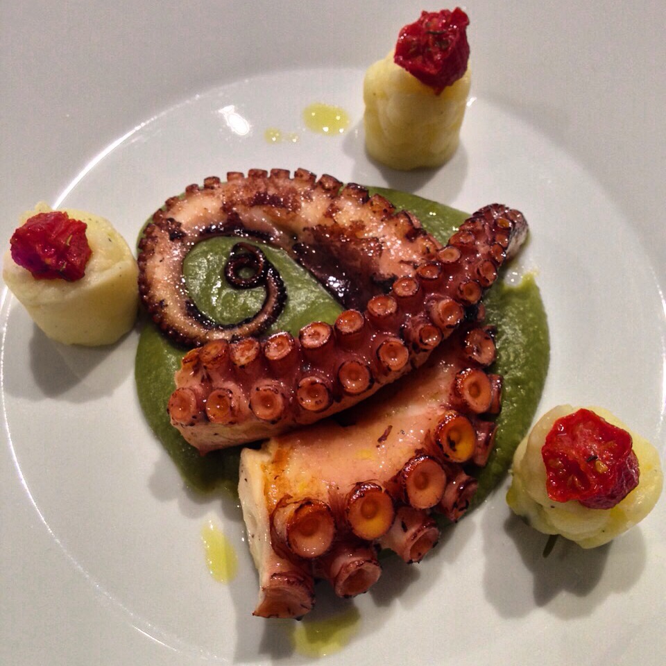 Lo spaghetto Mancini con le vongole e il polpo arrosto su vellutata di piselli con cilindri di patate schiacciate e pomodorini confit.