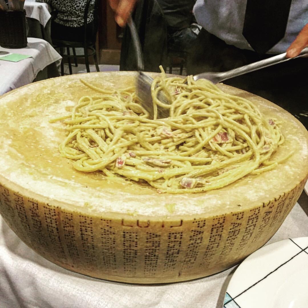 Una decina di giorni fa Achille Polonara si è divertito con una carbonara condita dentro la forma di parmigiano al ristorante Pizzeria Jolly di Reggio Emilia. Abbiamo anche la documentazione fotografica..