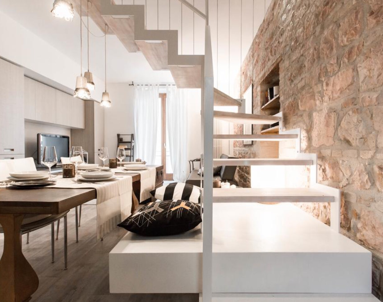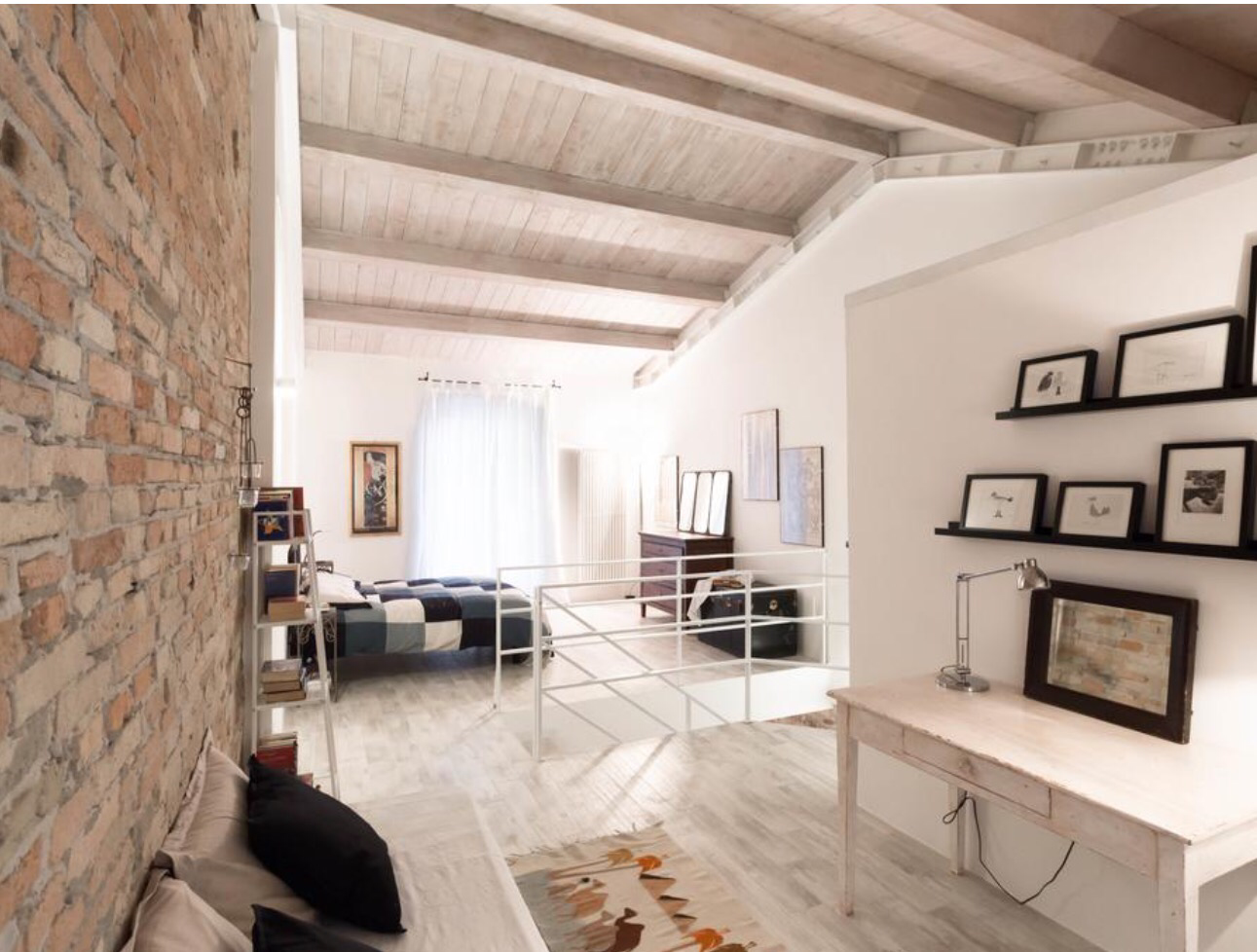 Un bel tavolo per il convivio dove abbiamo subito fatto l’aperitivo con un Lacrima riserva 2013 di Vicari, primosale e stracchinato di Mark. La sala TV che si sviluppa assieme a una cucina moderna e dotata di tutti gli elettrodomestici possibili, un bagno di servizio al piano terra, tutto chiaro abbinato ai mattoni a vista. Poi la scala che porta al soppalco, la zona notte e il bagno principale, un baule che arriva dall’ OHIO, un lettone romantico e l’angolo per la lettura.