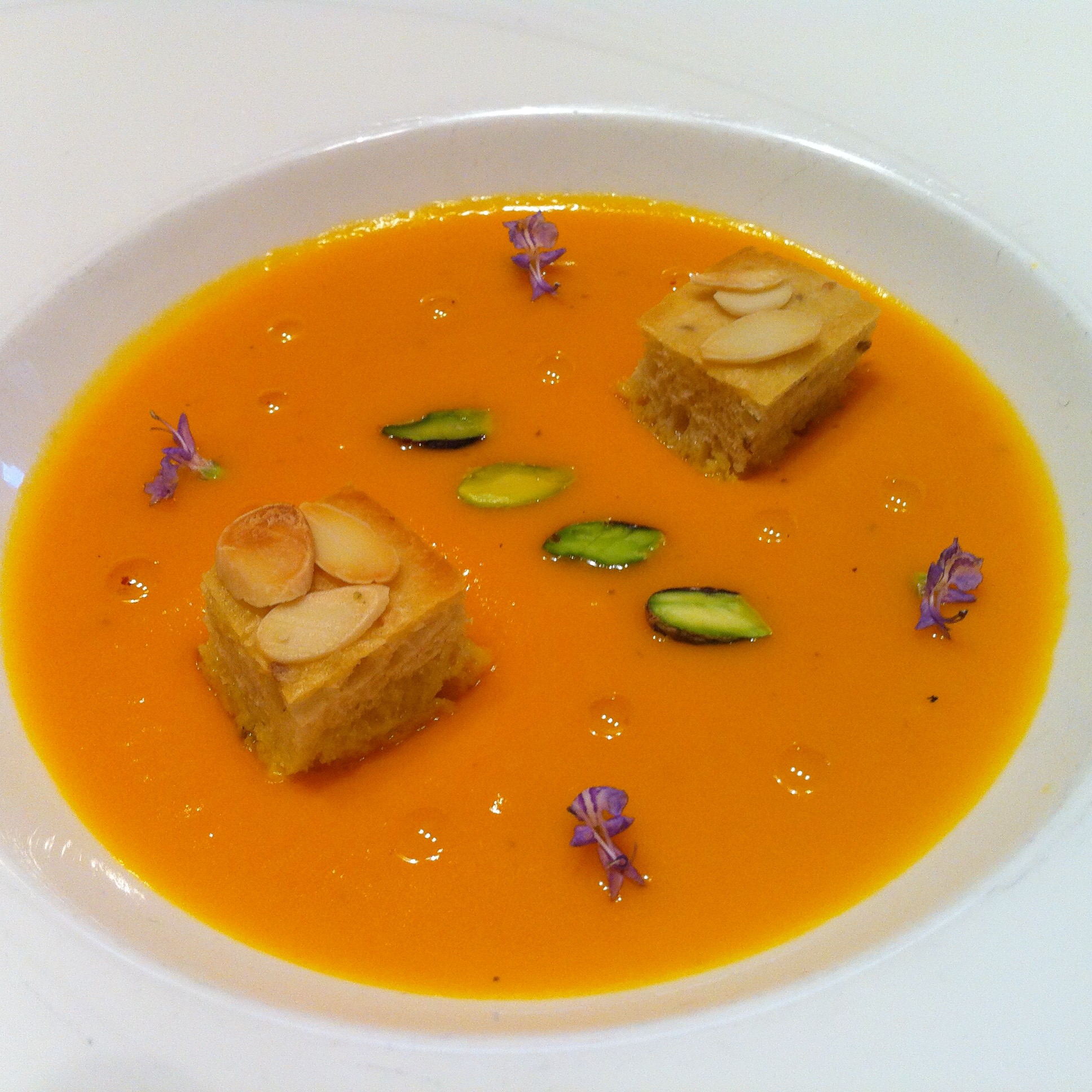 Ingredienti: 800gr di zucca gialla, focaccia al burro e mandorle, pistacchi, fiori di rosmarino, maggiorana, curcuma, brodo vegetale, olio piccante, 10gr di burro, olio, sale.