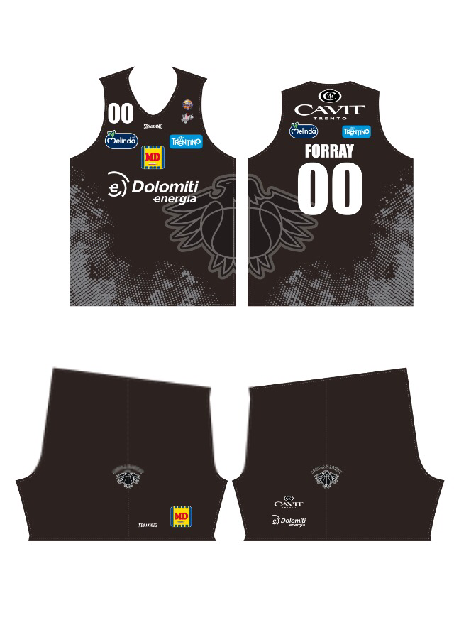 Bel lavoro di Spalding – realtà in grande crescita in termini di investimenti e presenza in tutti i campionati, non solo la serie A, con le divise di Trento. La nera away ha una grinta pazzesca, è davvero molto “garage” come piace a me. Davvero un bell’ effetto che in qualche maniera attenua la presenza comunque cospicua dei marchi sulla maglia. Interessante la scelta dell’aquila su un lato che si completa sul retro della canotta. La bianca con l’effetto “sporco” del nero è senz’altro un salto di qualità rispetto alla passata stagione, ma è sul nero che Trento si becca un bel 7