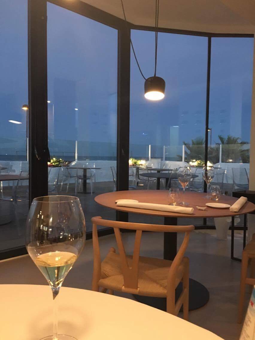 Elegante, minimale, molto chic, le lampade di Flos che scendono dal soffitto, le sedie di Carl Hansen, ampie vetrate con gli infissi scuri che guardano il mare, colori tenui, c’è sabbia, bianco, un po’ di nero, tanta luce, è un locale proprio come piace a me. È un posto che qui mancava, finalmente ambizioso, attento al dettaglio, con un servizio impeccabile, in cui il concetto di “less is more” abbraccia straordinariamente l’umanità che tutto lo staff trasmette ogni secondo che sei lì.