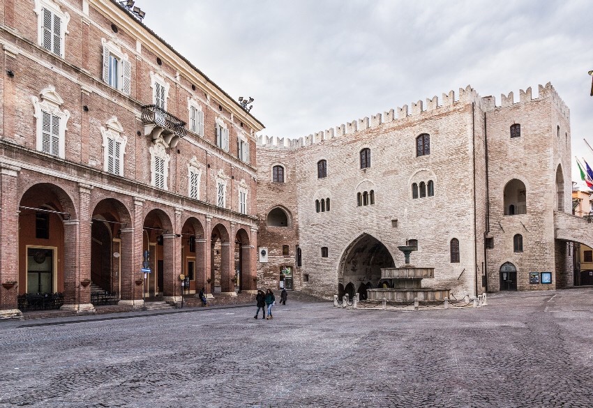 Monumento di forte suggestione, è definito uno dei più alti esempi di stile gotico nelle Marche. S’innalza sopra un ardito arco a sesto acuto( alto 11,70mt- largo9,75mt-lungo15,60mt) sotto il quale sono appena percettibili frammenti di pittura(risalenti al 1325) di tal Ventura di Francesco. Da rilevare la merlatura ghibellina aggiuntavi più che per richiamo alla possibile primitiva merlatura, solo per gusto estetico durante la ristrutturazione operata dall’architetto Icilio Bocci tra il 1911 ed il1922. Lo splendido edificio pubblico ha una sua peculiarità tipologica “a ponte”, in ricordo della colmata dell’antico fiume cittadino, che scorreva sotto di esso, e dell’unificazione dei quattro quartieri cittadini. Eretto nel 1255, interamente in pietra bianca di Vallemontagnana, modificato più volte, e costituito di tre corpi di fabbrica dei quali, quello centrale, presenta il caratteristico voltone ogivale di sottopasso della strada e le eleganti trifore. Al di sotto dell’arcone restano interessanti affreschi ( sec.XIII-XIV ) che rappresentano scene di guerrieri in battaglia e una enigmatica ruota della fortuna mossa da una figura femminile. Lungo il suo ampio corridoio è allestita una galleria d’arte permanente, che raccoglie la riproduzione fotografica, in grandezza naturale, di tutte le opere del Gentile.