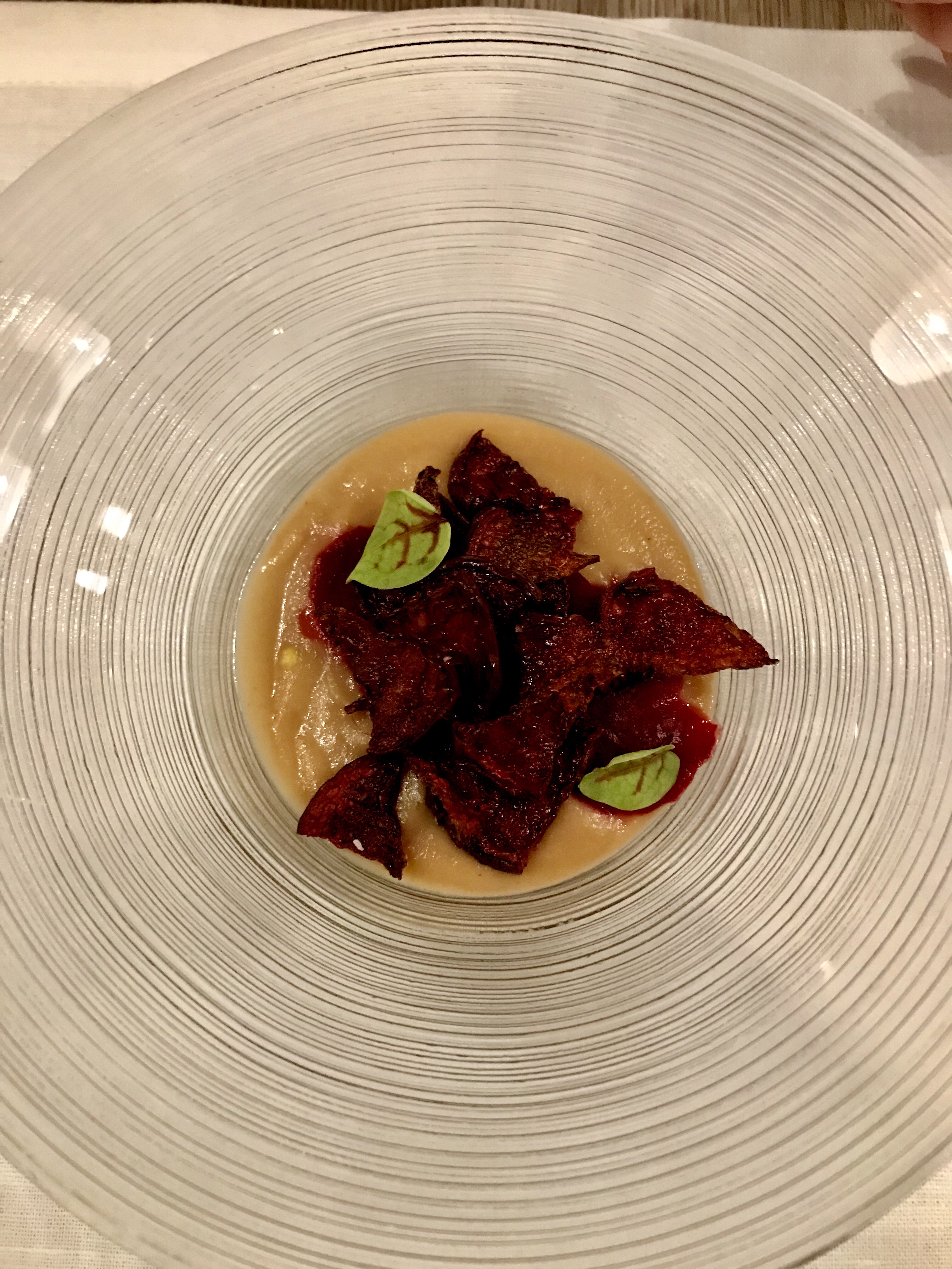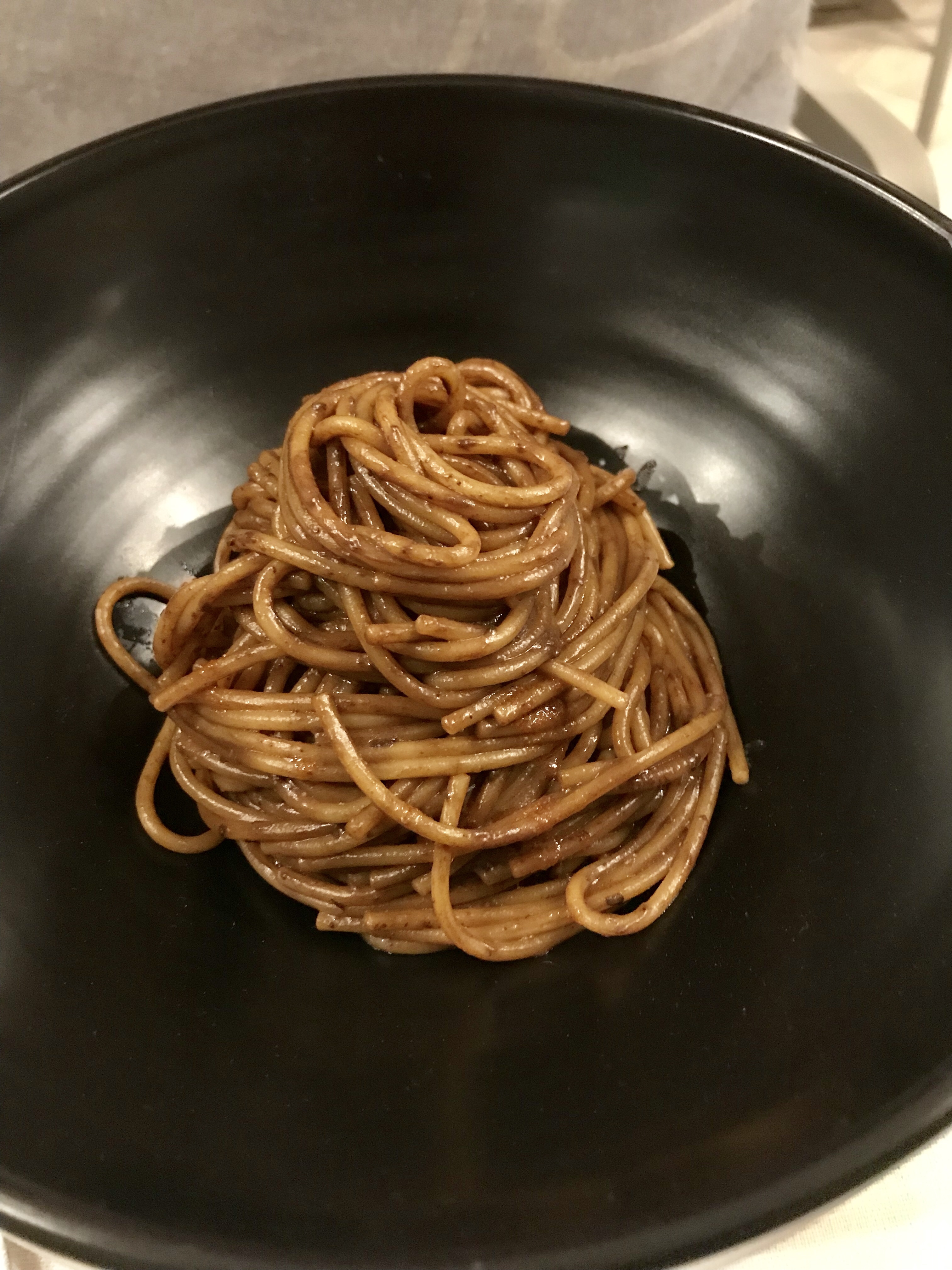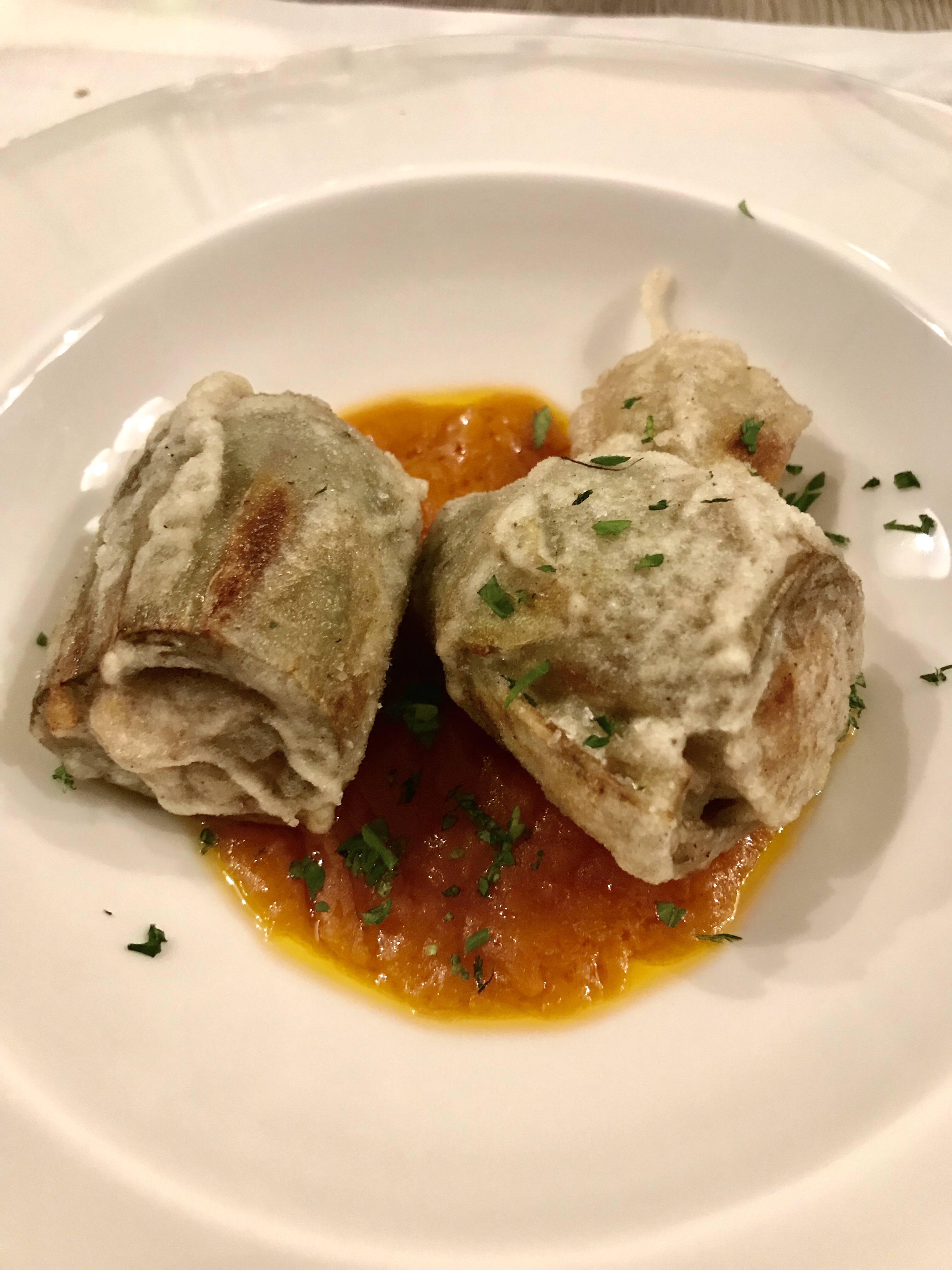 C’è da dire che la nostra prima esperienza vegana è stata divertente oltrechè golosa, a partire dall’entrèe che ci è stata offerta (verza imbottita di polenta) passando per l’antipasto all’italiana che abbiamo condiviso (sono sei portate “signature” della Chef Annalisa Presta, un trionfo di verdure interpretate e cotte in maniera divina, la melanzana ripiena, il cavolfiore e le tre consistenze di bietole assolutamente da urlo) per finire con gli spaghetti aglio nero, olio e peperoncino e con due carciofi che ci hanno fatto miagolare.
