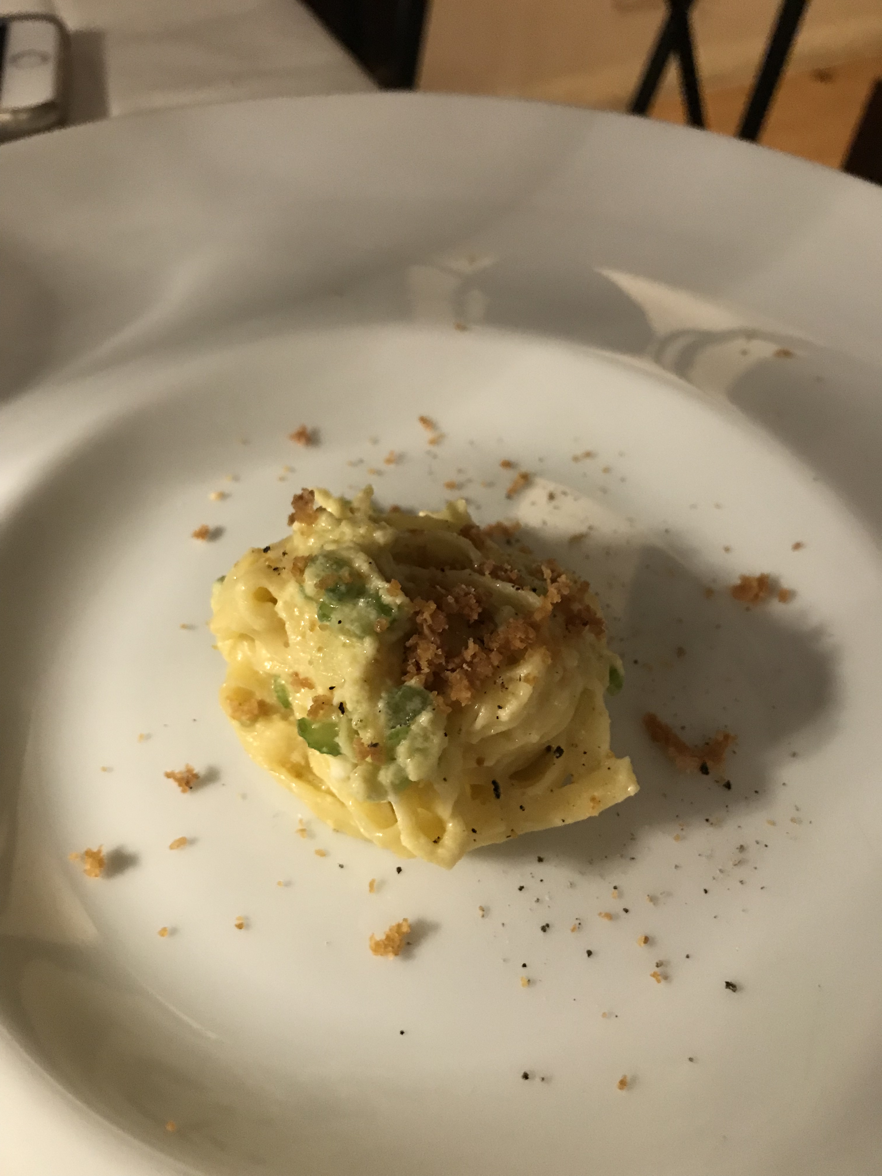 Che ci accoglie con una atipica entratina a base di pasta, tagliolini con un ragù di sedano e un calice di Fiano.