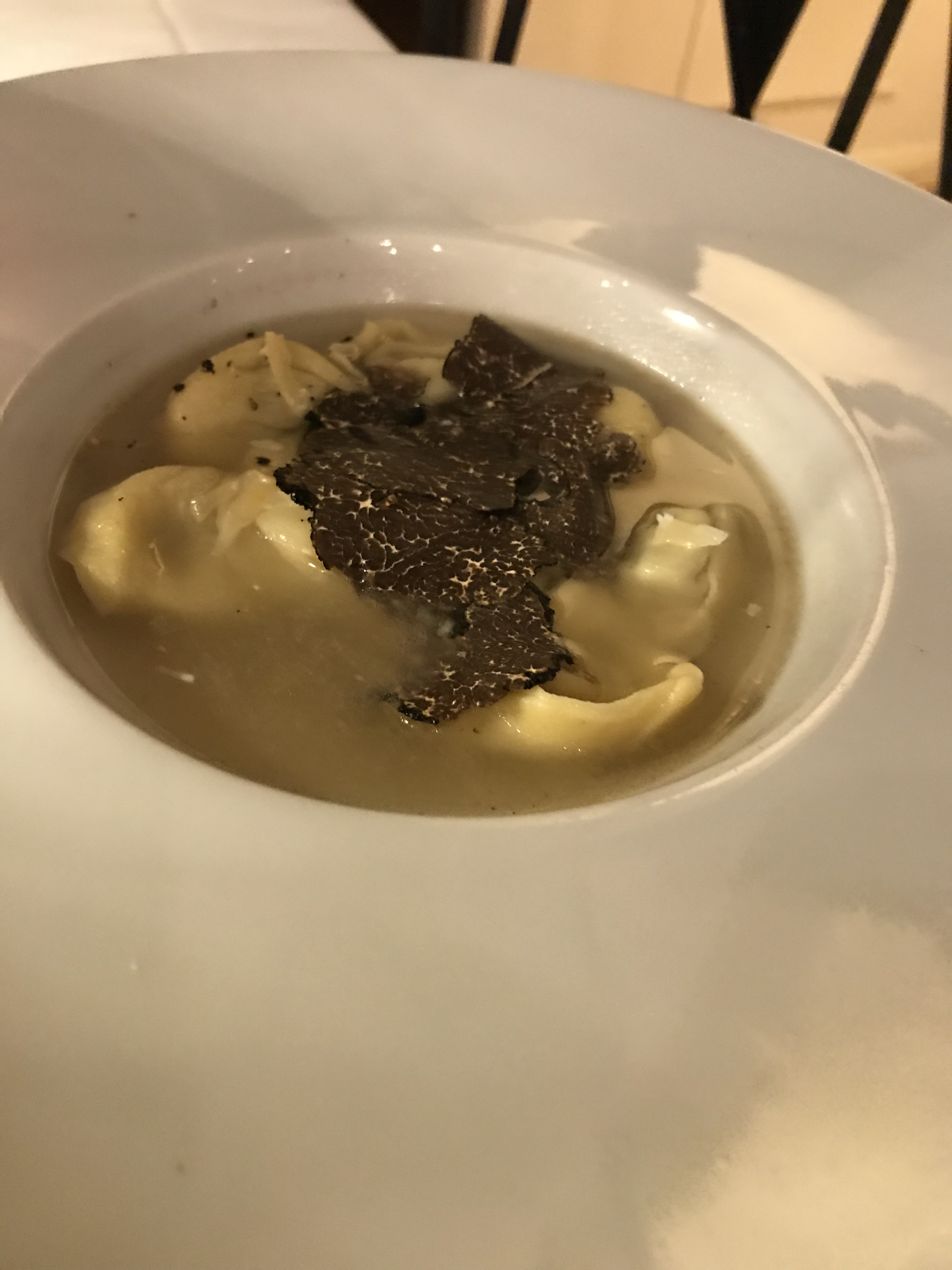 Poi una zuppa di sedano con baccalà tra Irpinia e oriente per me, ed i cappellacci tartufo nero e cappone per lei. Apprezzatissimi entrambi.