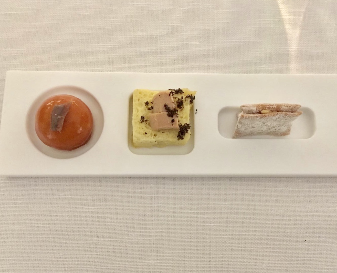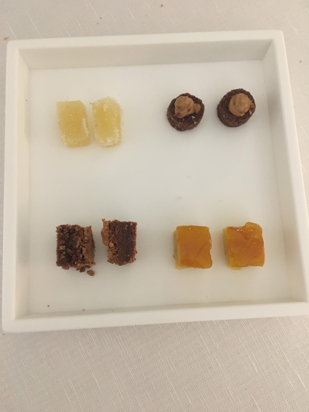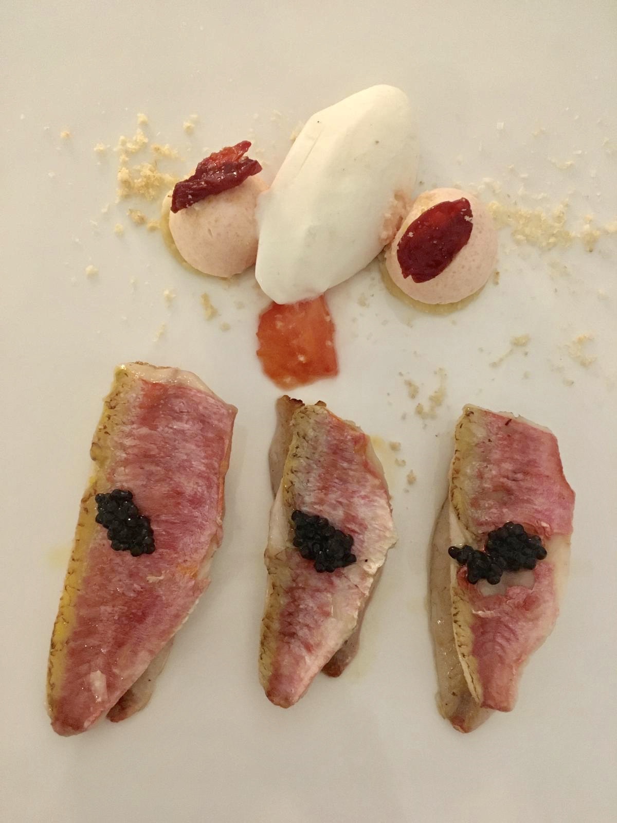 Veruska è una fan della capasanta e ci si è fiondata (non male), io ho scelto una proposta tutt’altro che velleitaria come la triglia cotta a vapore con quattro consistenze di pomodoro : concentrato di pomodoro, pomodoro essiccato, bavarese al pomodoro, caviale, gelato allo squacquerone e acqua di pomodoro per lavare la bocca a fine portata. Una bella idea per un ex pesce povero.