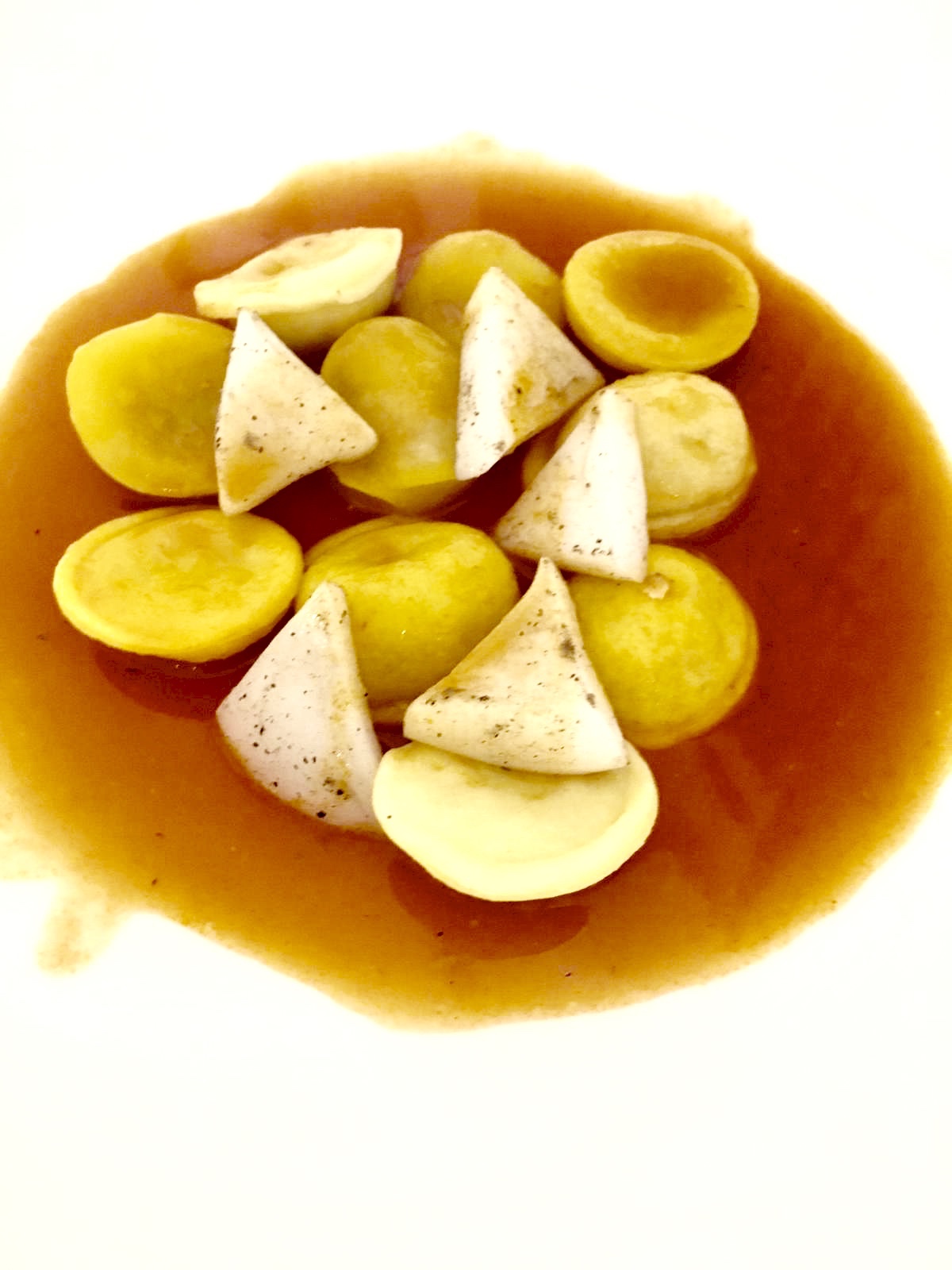 Il primo è un omaggio alla tradizione: buoni i bottoni di pasta all’uovo ripieni con una leggera emulsione di seppia e olio, accompagnati da un sugo di brodetto all’anconetana.
