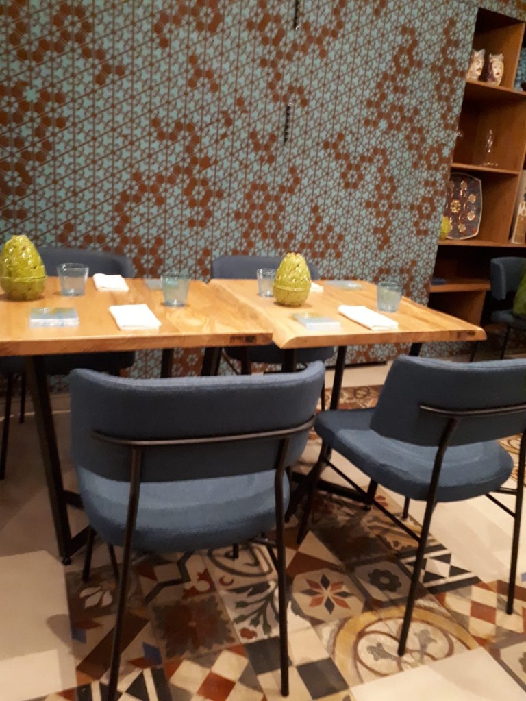 Siamo subito rimasti colpiti dal design raffinatissimo dello spazio, con due grandi oblò a sfondare le pareti di cucina a vista e sala, dando profondità a tutto il ristorante, la cui idea è quella di portare a Milano la magia di una Sicilia post moderna nei dettagli della tradizione, nei pavimenti, sulle pareti e in tavola con i meravigliosi oggetti di Thalass. I tavoli li abbiamo trovati molto chic: rettangolari in faggio, senza tovaglie, che è un po’ il trend del momento.