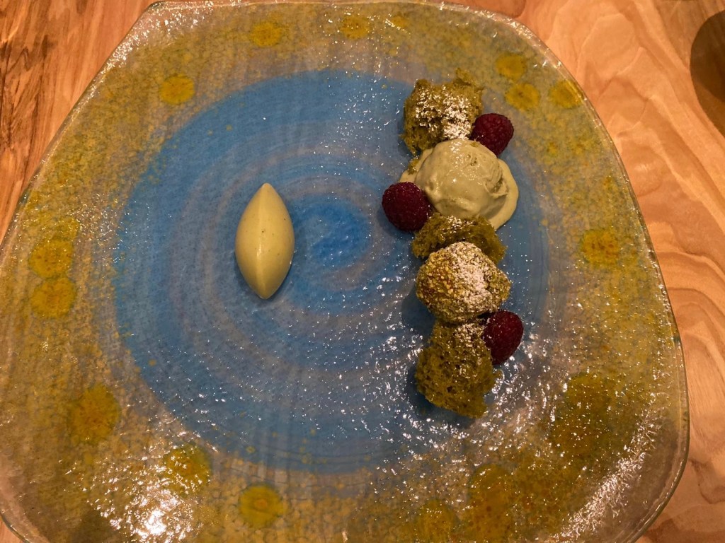 Infine un dolce al pistacchio in tre consistenze con un bicchiere di Moscato di Noto. Ma eravamo tentatissimi dalla nuvola di cassata.
