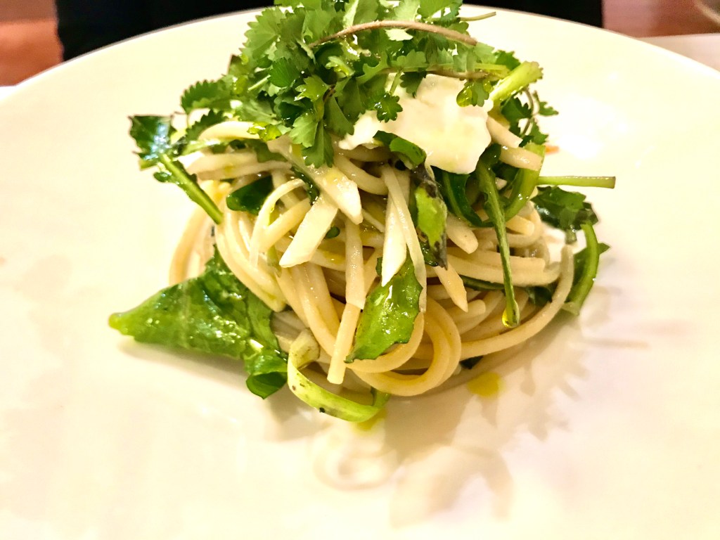 Abbiamo mangiato una mezza pizza con caciotta, pepe e limone, il fritto di broccoli, cremini, parmigiana di gobbi e olive all’ascolana. La zuppa cruda di finocchi, olive, agrumi, fior di finocchio e misticanza: una talentuosa rivisitazione dell’insalata invernale che preferisco.