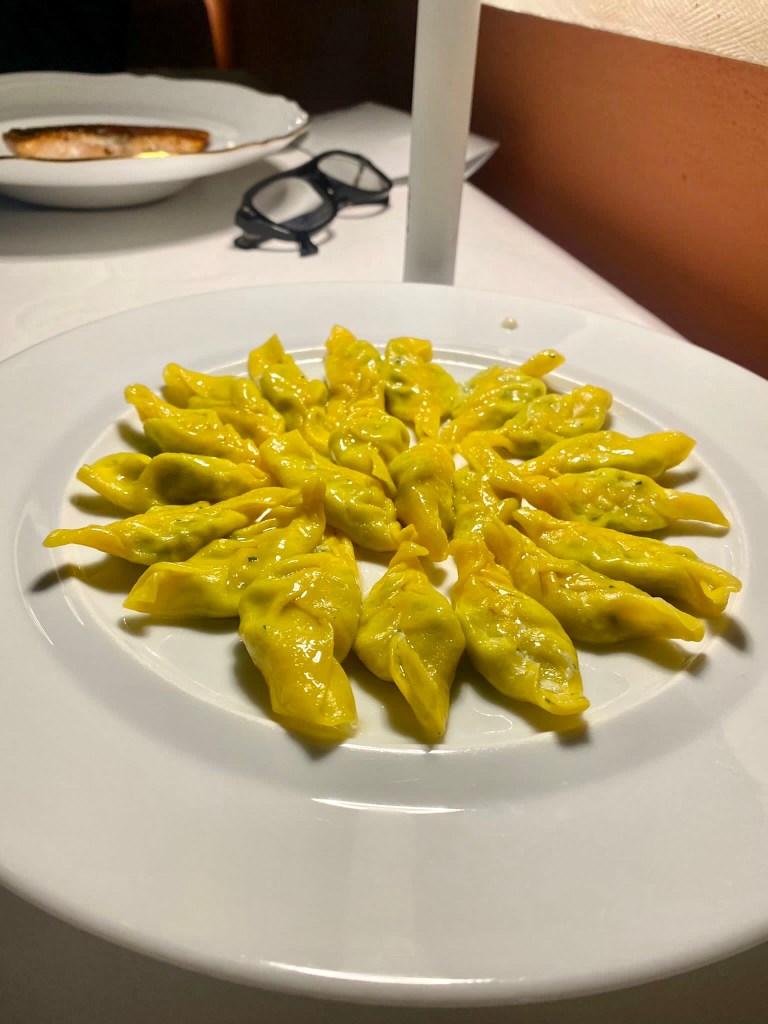 Veruska ha scelto fiori di zucca e tortelli piacentini, quelli con la coda. Per me uovo in camicia e saracca poi la trota.