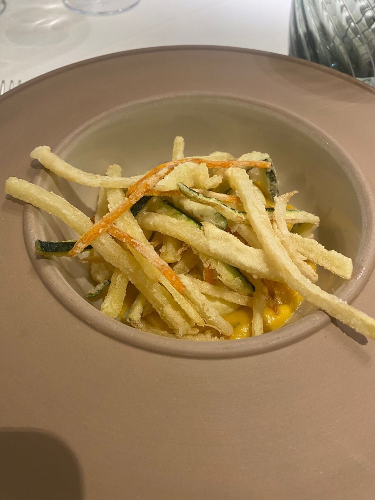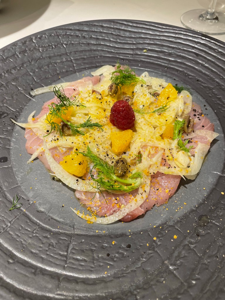 Veruska ha scelto l’antipasto veg con il fondente di zucca, tomino e verdure croccanti, mentre io ho optato per un freschissimo carpaccio di ricciola con finocchio, arancia e olive. Un po’ convenzionale ma azzeccato.