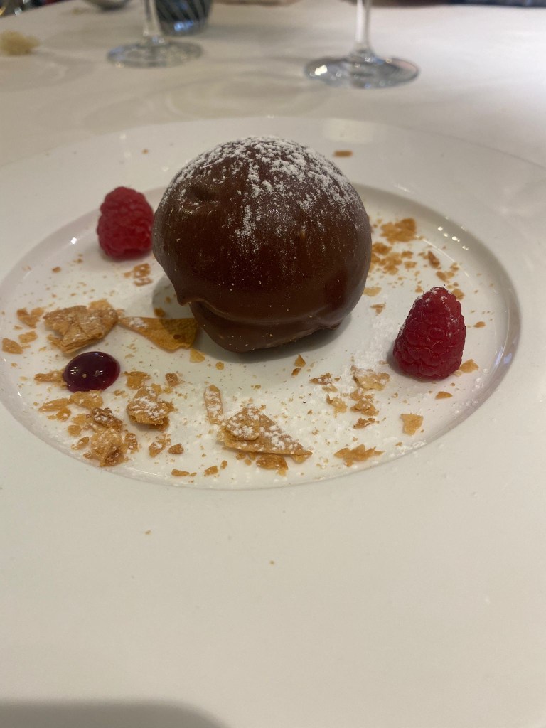 Dolci di ordinanza sulla lavagna di fine pasto: la nostra scelta è caduta sulla sfera di nocciola con cuore di lampone. Buona, non indimenticabile.