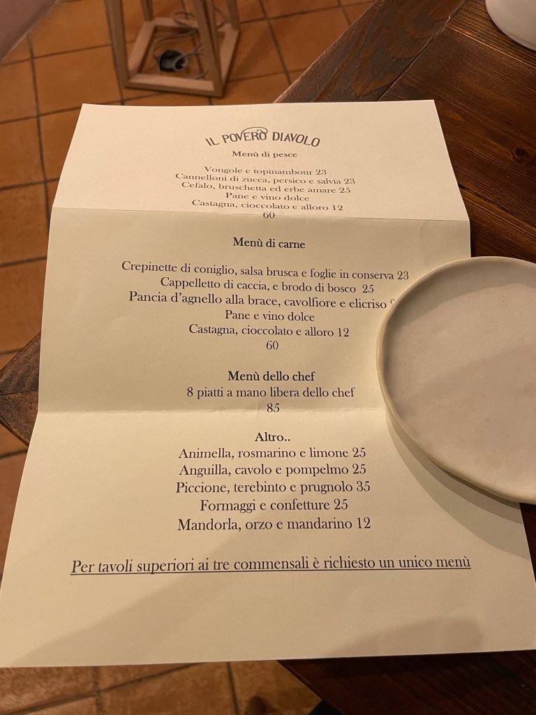 Al Povero Diavolo trovate un menù stella Michelin a 60 euro, un ambiente caldo e giovane, uno Chef talentuoso, ci ha conquistato nella sua uscita ai tavoli, trasmette davvero belle sensazioni, una bella brigata di ragazzi attenti e competenti.