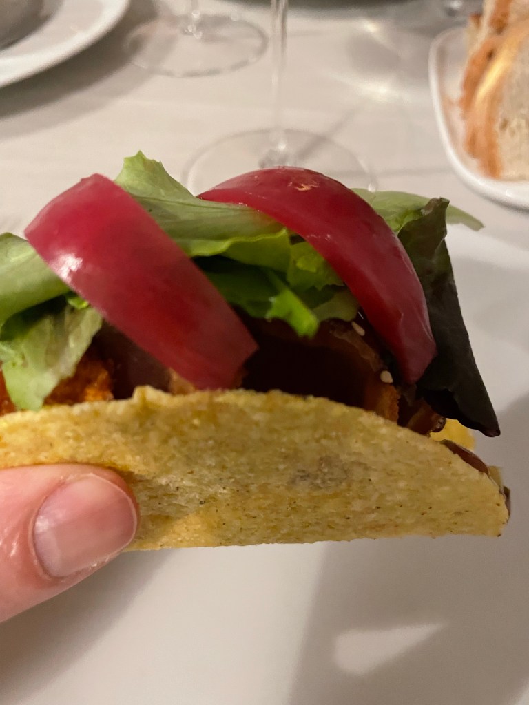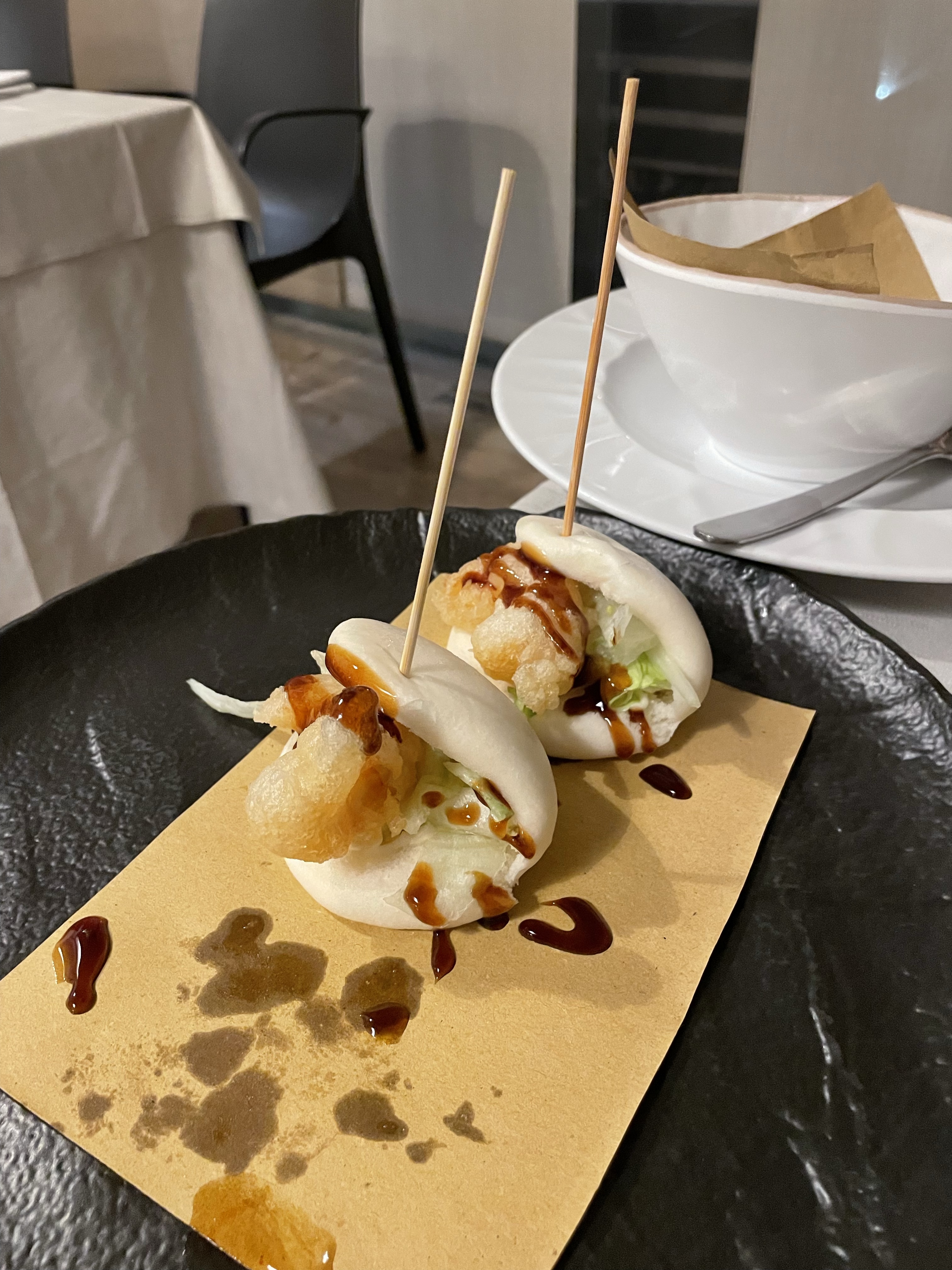 Abbiamo scelto tre antipasti quasi “street”, da mangiare con le mani: il grande classico delle olive di pesce, poi le novità dei tacos farciti con tataki di tonno in tempura, maionese e salsa teriyaki e i Bao-Buns con mazzancolle in tempura e mayo wasabi: un po’ ruffiani ma golosi.