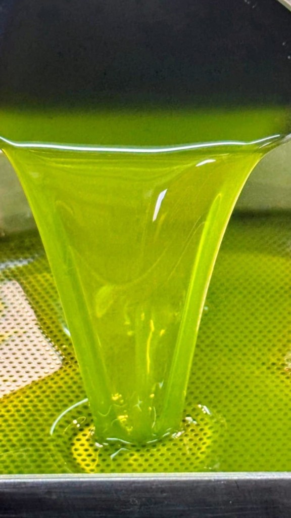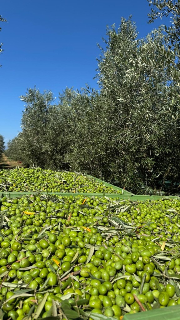 LA RACCOLTA – Si parte con Bianchera (Istrska Belica) e Coratina la varietà da raccogliere. Le reti sono distese e il grande pettine guidato da Diego lascia cadere le olive e Roc e Vid con i piccoli pettini a batteria, completano il lavoro. Milan, Dario e Ales, raccolgono le olive in piccole cassette e spostano i teli. Sandi controlla, interviene quando vede che è necessario. Così, un olivo dopo l’altro, fino al primo pomeriggio. Poi si va in frantoio dove i protagonisti sono i genitori di Sandi, Milan e Slavia, i figli di Sandi, Roc e Vid, i collaboratori fedeli, Dario, Diego e Ales. Si parte. Le olive scorrono, Slavia toglie le foglie e i piccoli rami. La tecnologia delle Officine Meccaniche Toscane è perfetta, tirata a lucido. Basta poco, l’olio esce. Quello della campagna 2025. Coratina. Anzi Koratina, col k.